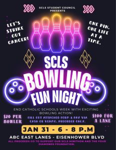 The Student Council is having a Bowling Fun Night on Saturday, January 31st to finish out Catholic Schools Week. What better way to celebrate our SCLS family than with a night of fun all together! All proceeds from the event will go to the Four Diamonds Foundation and count towards our MiniTHON total. Tickets are PREORDER ONLY and all orders are due by January 23. Please see the information below and find the attached form and flyer for more details.