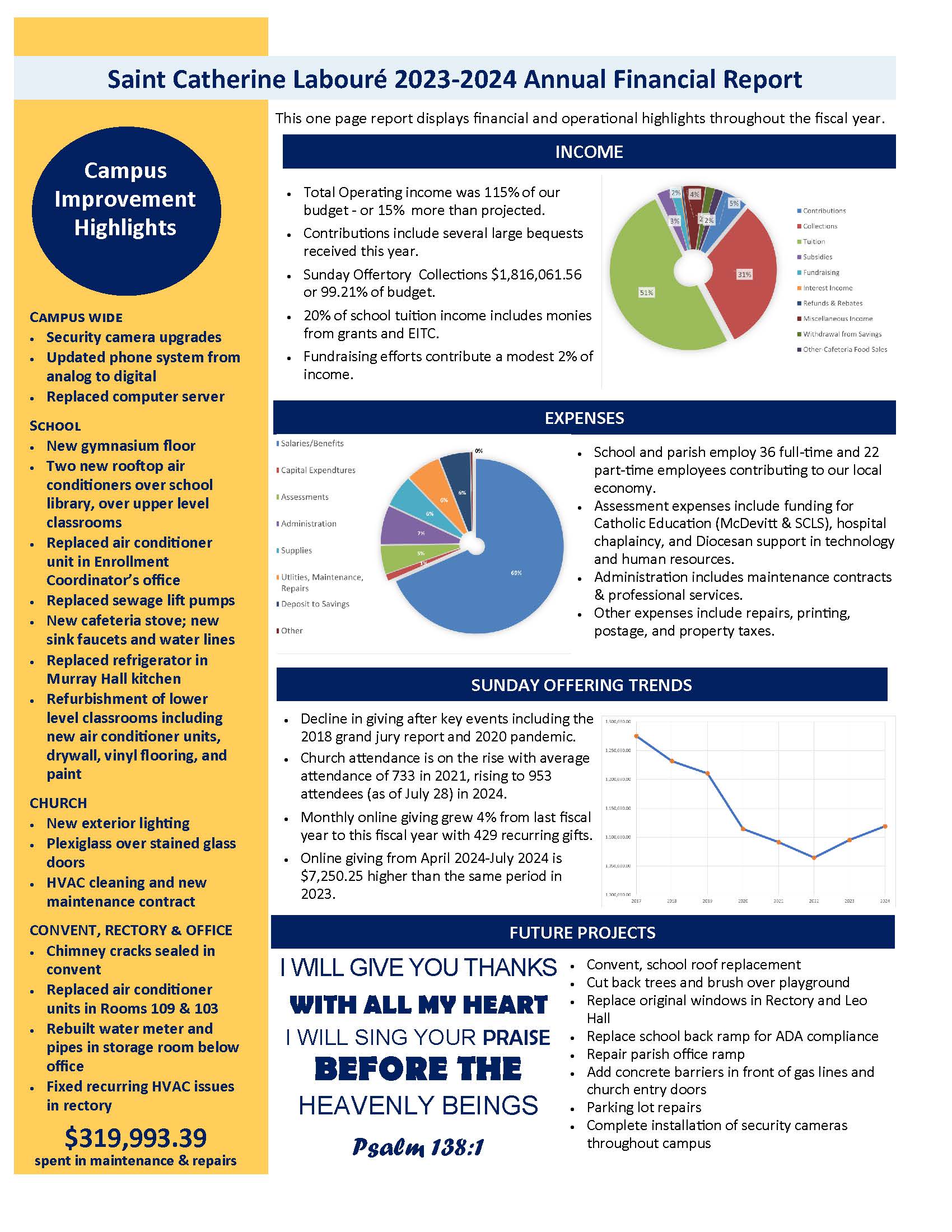 We are committed to financial transparency and responsible budget management, ensuring that your generous contributions are utilized effectively to support our parish’s mission and ministries. We invite you to delve into the detailed financial report included in the bulletin insert to gain an understanding of our financial performance. You may always contact us with questions.