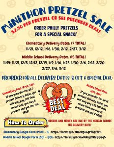We are starting an exciting new fundraiser for our SCLS MiniTHON! We will begin selling Philly Pretzels as a special Friday snack during the time leading up to our MiniTHON event. Elementary students (PreK-5th) will have 7 opportunities to purchase a pretzel and the Middle School students will have 15. The delivery dates are as follows:
